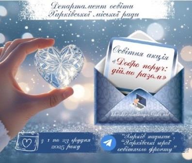 «Добро поруч: діймо разом» – слова, які в грудні об’єднали тисячі сердець та стали відлунням ваших дій, думок і намірів. Департамент освіти Харківської міської ради щиро дякує всім учасникам - кожному й кожній, хто долучився, відгукнувся, зробив свій крок назустріч добру, наповнив цю