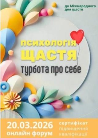 Всеукраїнський онлайн-форум «Психологія щастя: турбота про себе» з нагоди Всесвітнього дня щастяОпублікував admin. Дата публікації 16/03/2026Теги: Загальні