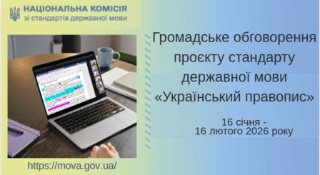 ЗагальніГромадське обговорення проєкту стандарту державної мовиОпублікував admin. Дата публікації 19/01/2026Теги: Загальні