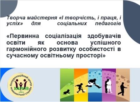 27 – 28 жовтня 2025 року, з нагоди Міжнародного дня соціального педагога, Координаційний центр психологічної служби системи освіти міста Харкова організував і провів серію тренінгових занять у межах творчої майстерні «І творчість, і праця, і успіх». Темою заходу стала «Первинна соціалізація здобувачів освіти як основа успішного гармонійного розвитку особистості в сучасному освітньому просторі».