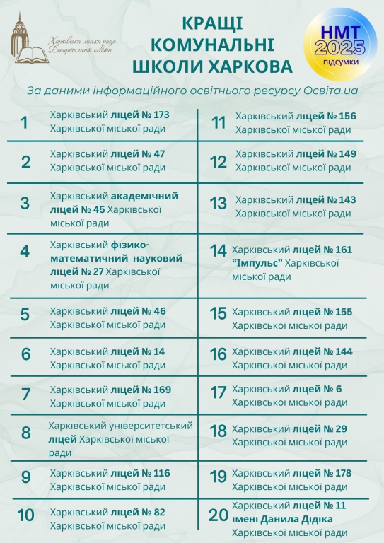 ПІДСУМКИ НМТ-2025: 20 КРАЩИХ КОМУНАЛЬНИХ ШКІЛ ХАРКОВА