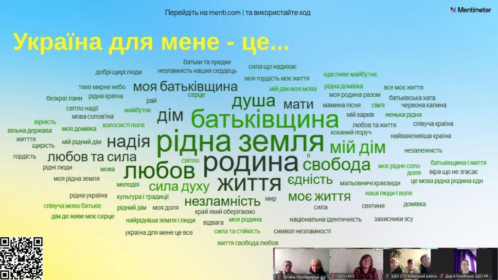 Наприкінці заходу педагоги, за допомогою онлайн-сервісу Mentimeter, створили спільну, надихаючу мапу-колаж зі словами «Україна для мене – це…». Цей інтерактивний елемент став символічним підтвердженням єдності та високого патріотичного духу освітян.