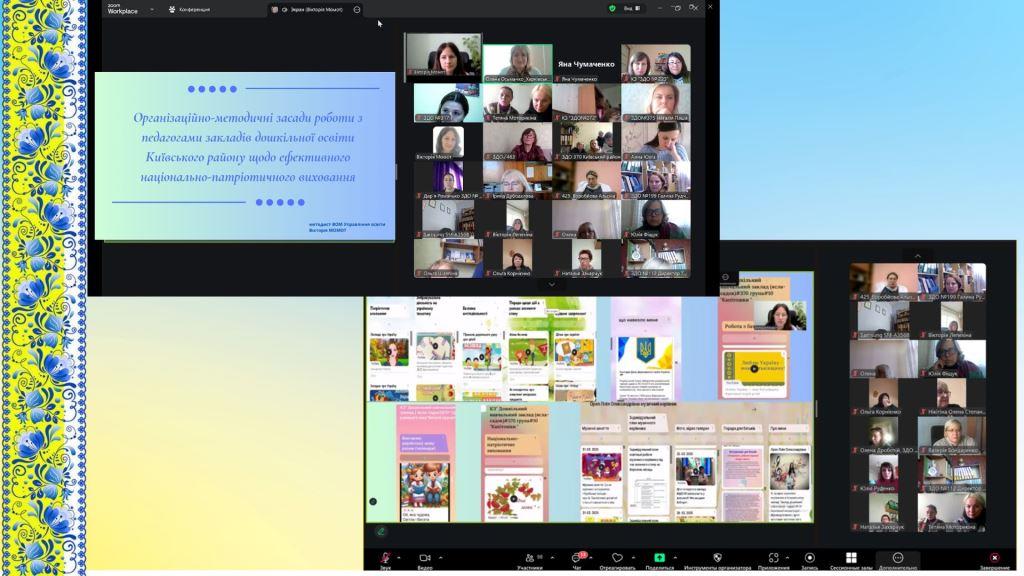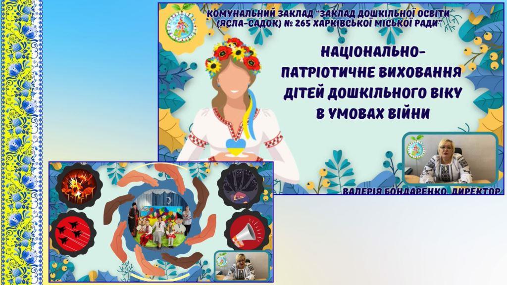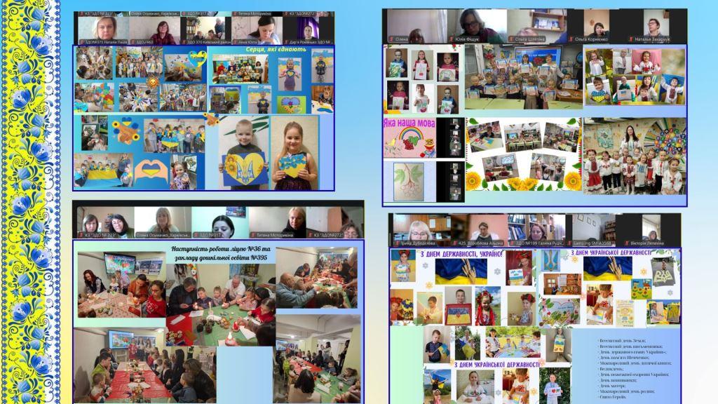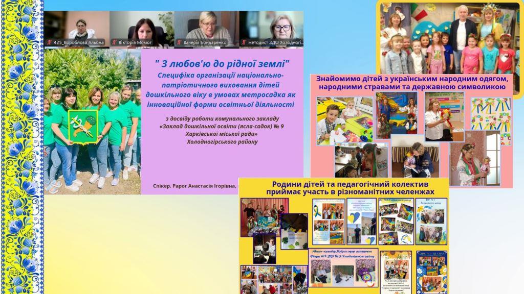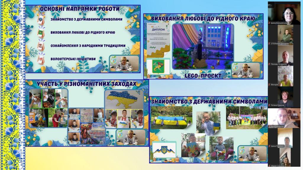 Педагоги дошкілля: Момот Вікторія, методист відділу освітнього менеджменту управління освіти адміністрації Київського району; Бондаренко Валерія, директор закладу дошкільної освіти № 265 Немишлянського району; Рарог Анастасія, вихователь-методист дошкільного навчального закладу № 9 Холодногірського району познайомили з досвідом роботи колективів щодо виховання дітей в дусі патріотизму та національної ідентичності.