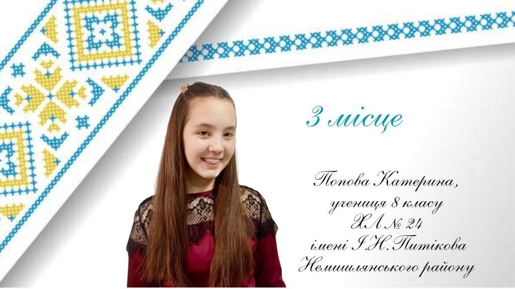 Попова Катерина, учениця 8 класу ХЛ № 24 імені І.Н. Питікова Немишлянського району;