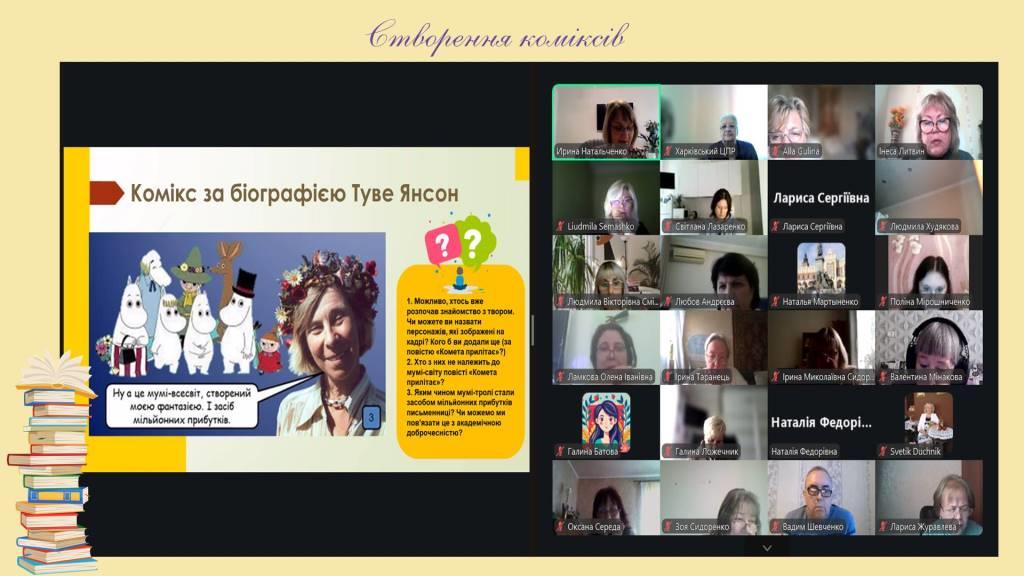 Крім того, Ірина Олексіївна поділилася досвідом створення коміксу за біографією Туве Янсон, що робить знайомство з життям письменниці більш динамічним і захопливим. Також розглядалися можливості використання піктограм і фотоквестів як інструментів для закріплення знань та організації проєктної діяльності учнів.