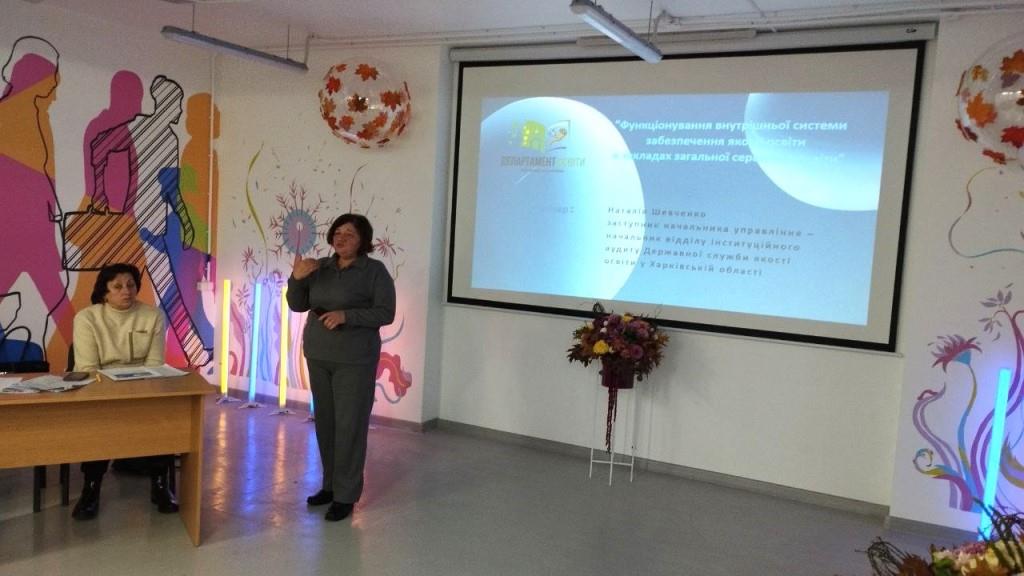 Своїми знаннями та практичними рекомендаціями щодо функціонування ВСЗЯО у школі ділилася Наталія Шевченко – заступник начальника управління – начальник відділу інституційного аудиту Державної служби якості освіти в Харківській області. Також вона провела живу дискусію та відповіла на розгорнуті запитання учасників.