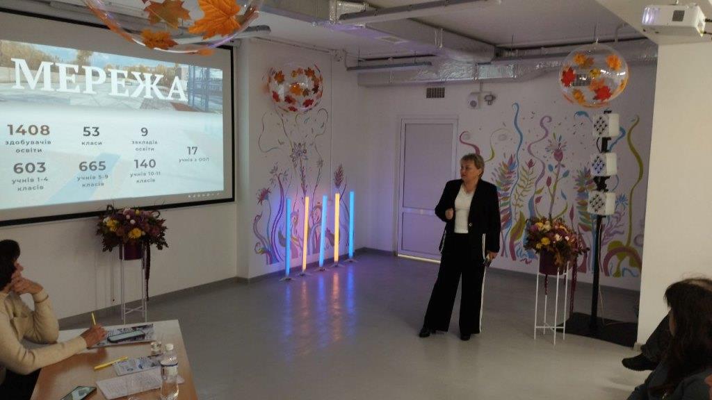 Директор ліцею № 105 Наталія Теплова ознайомила учасників із системою роботи ліцею, зосередившись на створенні безпечного освітнього середовища, включно з організацією роботи укриття та умов для дітей з ООП.