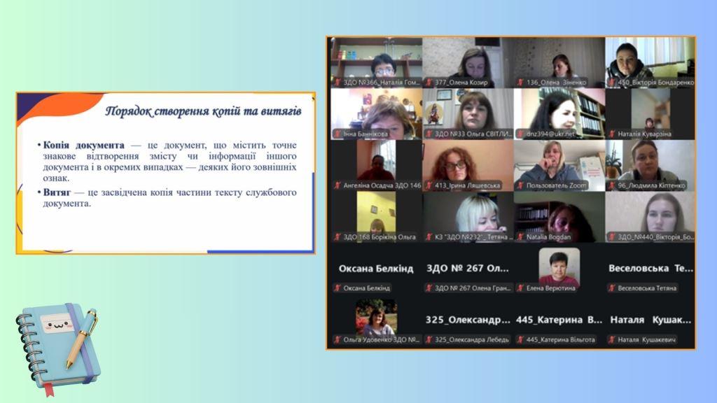 Спікер вебінару – Бражник Вікторія Вікторівна, начальник відділу кадрової роботи Департаменту освіти, ознайомила молодих керівників зі зразками наказів із кадрових питань, організацією контролю за їхнім виконанням, систематизацією та зберіганням документів, а також правилами складання наказів про прийняття на роботу, переведення на іншу посаду, звільнення, надання відпусток, довантаження тощо.