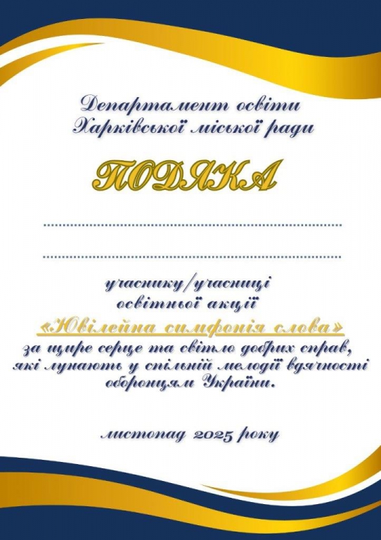 Департамент освіти Харківської міської ради щиро дякує всім учасникам освітньої акції «Ювілейна симфонія слова»! У межах акції упродовж листопада отримано 8681 роботу – 8681 особисту історію турботи. Кожна з них додає свою ноту до спільної мелодії вдячності та підтримки наших захисників. Учасники подарували їм тепло, натхнення й увагу, вклавши частинку серця у свої поезії, обереги, свічки, закладки, теплі речі та смаколики. 807 робіт опубліковано у телеграм-каналі «Харків надихає».