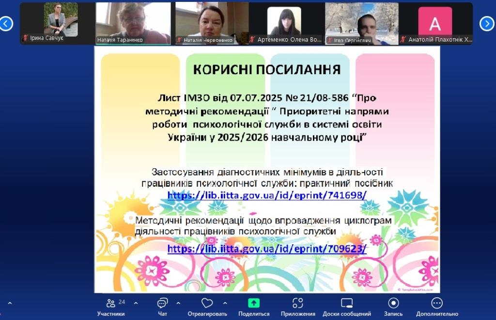 У лютому 2026 року в межах діяльності Школи молодого фахівця психологічної служби відбулося чергове онлайн-заняття на тему «Психологічний супровід професійного розвитку педагогічних працівників як запорука ефективної професійної діяльності педагога». У заході взяли участь 35 фахівців психологічної служби закладів освіти.