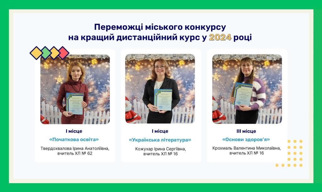 3 учителі стали переможцями міського конкурсу на кращий дистанцій- ний курс, посівши І місця у номінаціях «Початкова освіта» та «Українська література» (ХЛ № 16, 62), ІІІ місце у номінації «Основи здоров’я»/«Здоров'я, безпека та добробут» (ХЛ № 16).