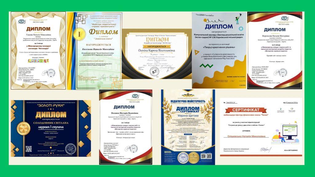 За підсумками 2024/2025 навчального року 43 педагоги закладів дошкільної освіти №№ 2, 4, 25, 36, 87, 108, 119, 123, 395, 464 посіли призові місця у Всеукраїнських та Міжнародних професійних конкурсах різних напрямів.