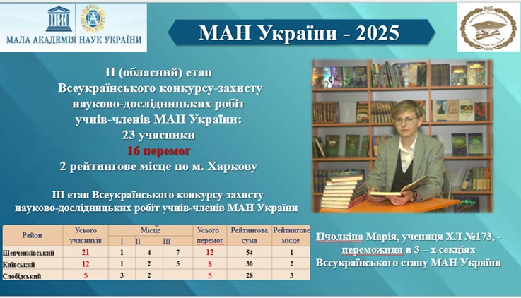 Результати обласного етапу МАН України: із 23 робіт, поданих на конкурсу, 16 стали переможцями, із них 5 – Всеукраїнського рівня.