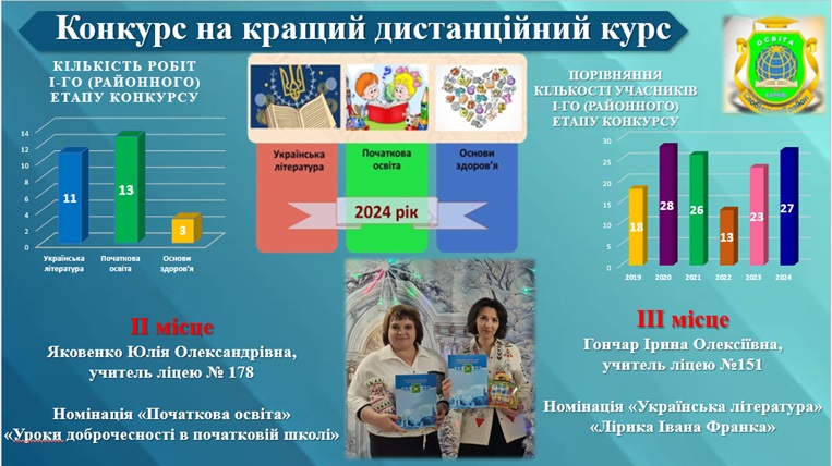 У І-му (районному) етапі конкурсу на кращий дистанційний курс за предметними номінаціями «Українська література», «Початкова освіта», «Основи здоров’я» взяли участь 27 учителів.
